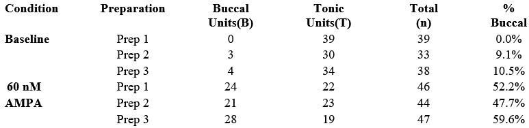 60 nM AMPA (n = 3): mean proportion of buccal units = 53.2% (SD 6.0%).