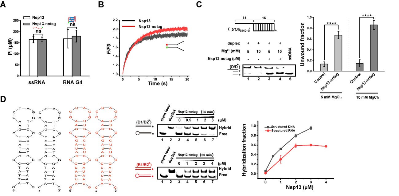 Even when ATP is abundant, the ATP-independent mode may enable rapid, local structural adjustments that bypass the kinetic delay of ATP binding and hydrolysis. As shown in Figure 1D, nsp13 exhibits high binding affinity for structured nucleic acids. In this scenario, nsp13 functions not as a processive motor but through a binding-driven mechanism, using the free energy of protein-nucleic acid interaction to transiently destabilize short duplexes or resolve local secondary structures such as G4s and stem-loops in an energy-efficient manner.