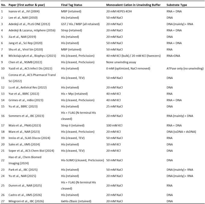 Summary of affinity tags, monovalent salt concentrations, and substrate types used in 27 published SARS-CoV/SARS-CoV-2 nsp13 studies