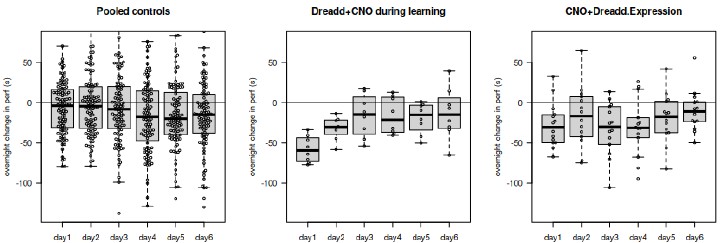 The performance on a given day depends on a cumulative process, so that the average measure of performance is not fully informative on what is learned or what is changed by a treatment (this is further explained in the text p9-10).The challenge is to deal with the multivariate relationships where initial performance, daily learning, and consolidated learning are interdependent. While in control groups these quantities show linear relationships, this is far less the case in treatment groups; this may indeed be due to the variability of the effect of the treatment (efficacy of viral injections) which adds up to the intrinsic variability in the absence of treatment.