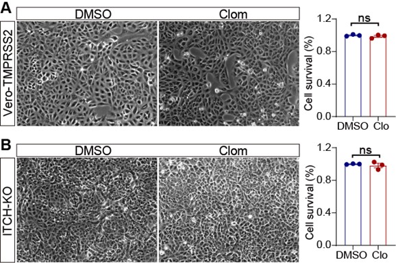 The authors should perform cell viability assays in clomipramine-treated cells. In addition, the authors should clarify whether clomipramine's antiviral effects depend on ITCH expression, given the comparable virus copy numbers in treated WT (Fig. S7B) and ITCH-KO cells (Fig. S7C)