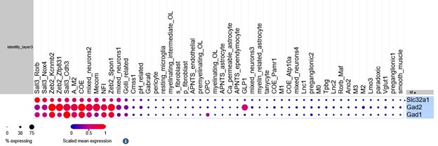 Balloon plot of Slc32a1, Gad1 and Gad2 across cell types. The GLP1-expressing neurons express Gad2 but minimal Slc32a1.