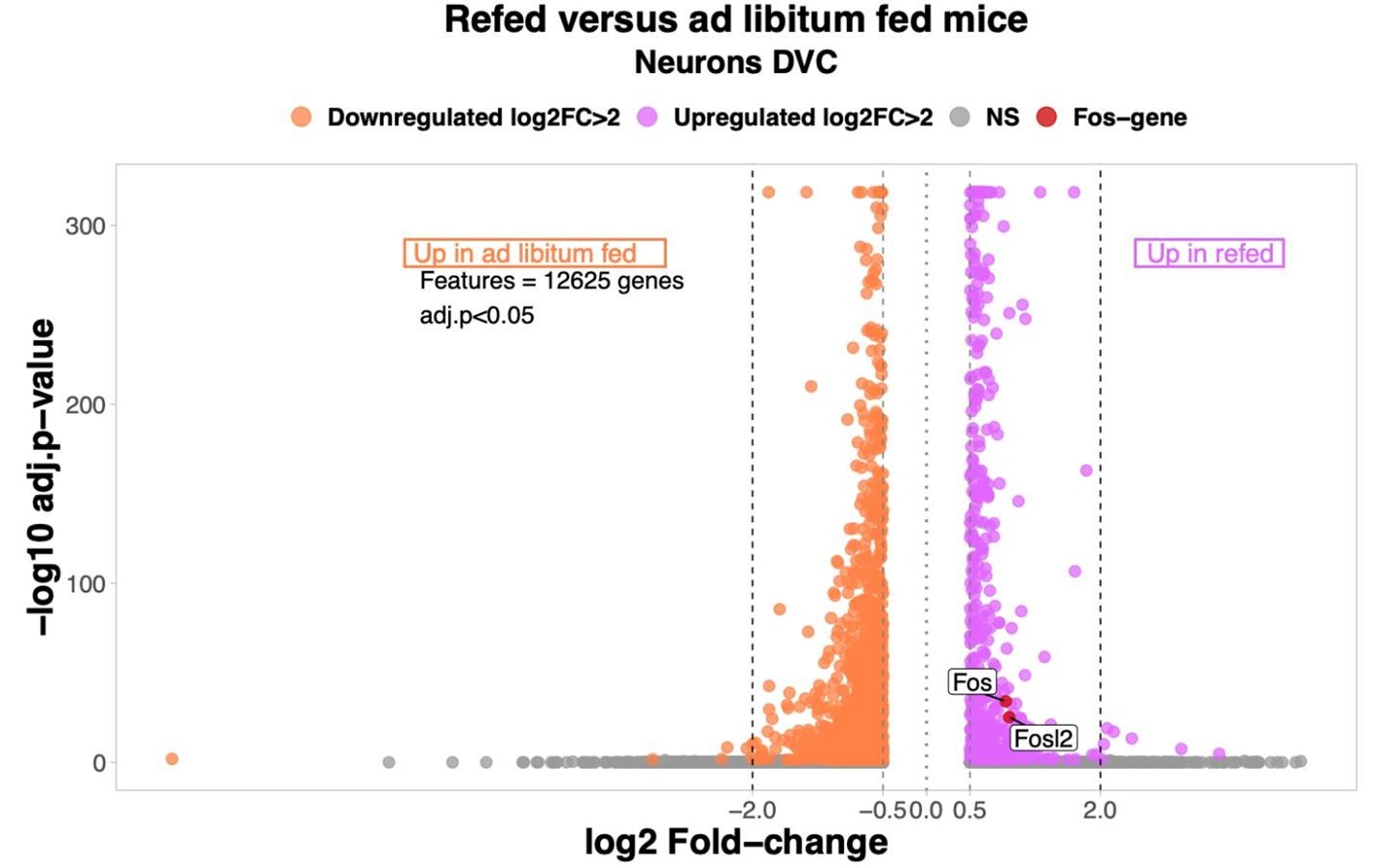 This is a highly salient point made by the reviewer. Including Fos expression serves as an internal validation of our refeeding condition and the absence of Fos mRNA levels from the original manuscript was an oversight on our part. As shown in our volcano plot, between ad libitum fed and refed mice, there are two significantly Fos-associated genes upregulated in the refed group. Therefore, we are confident that the snRNA-Seq analysis accurately captured rapid changes in response to refeeding in the DVC. Only genes differentially expressed (log2 Fold-change >0.5 per group) were considered in the analysis. NS= non-significant.