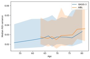 Median ROI variance across age bins for OASIS-3 and AIBL. Shaded areas represent variability across regions within each age bin.