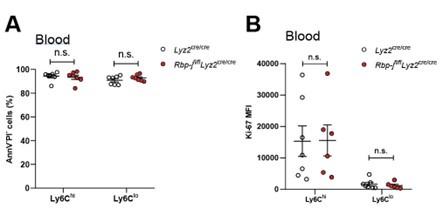 Here, we employed annexin V (AnnV) and propidium iodide (PI) staining to evaluate apoptosis and cell death in Ly6Chi and Ly6Clo blood monocytes from control and RBPJ deficient mice. The results showed no significant difference in the levels of apoptosis and cell death between the two groups (see Author response image 2 below). The statistical data for Ki-67 expression obtained from multiple experiments, and the expression of Ki-67 showed no significant difference between the control and RBP-J deficient mice (see the figure B below). In Figure 2C, each dot represents 2-3 mice, and there were no differences observed between control and RBP-J deficient mice at multiple time points during the repeated measurements.